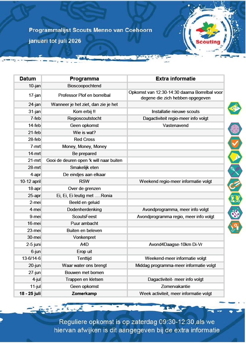 Ja, wij zijn een scoutsgroep met tradities, wij openen en sluiten door de vlag te hijsen (met salueren), we dragen allemaal eenzelfde uniform en onze Menno das, dit is omdat wij structuur willen bieden en aan iedereen willen laten zien dat we een groep zijn en daar bewust voor kiezen. Dit geeft trots en verbinding. Uiteraard is het ook wel leuk om die mooie vlaggen te zien wapperen in de wind.